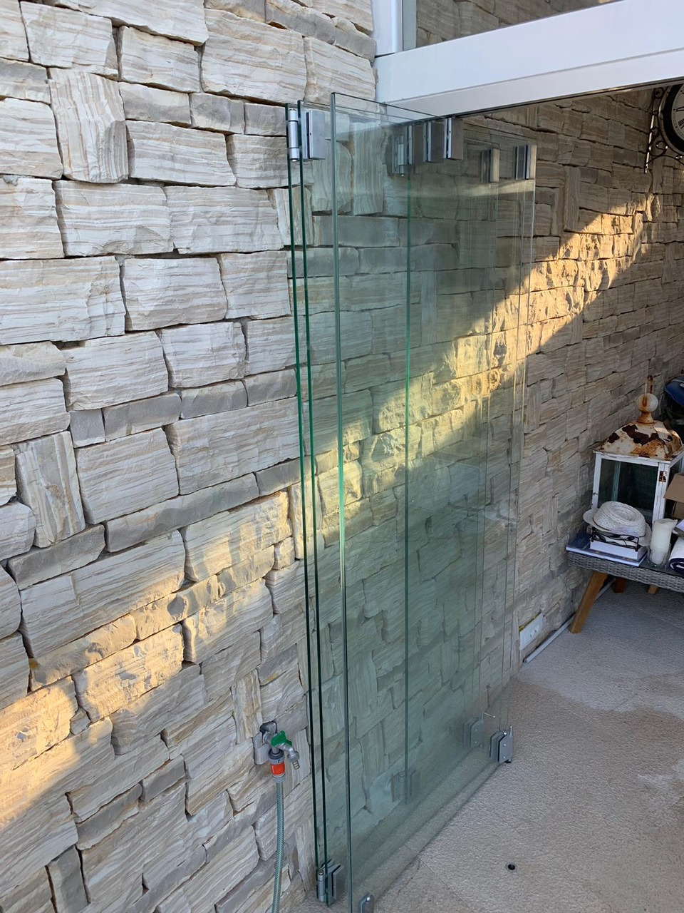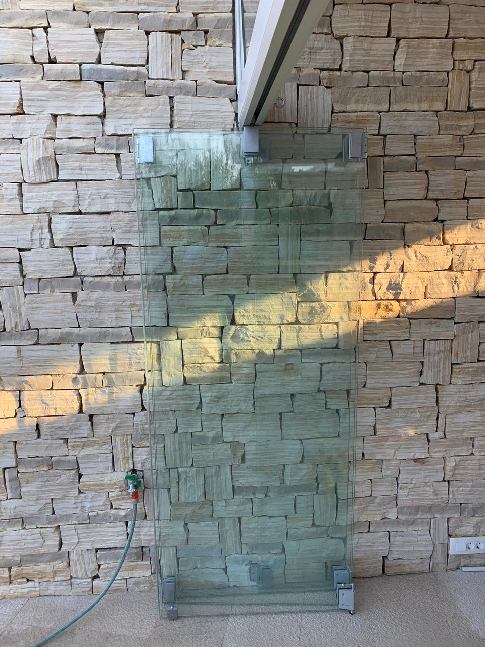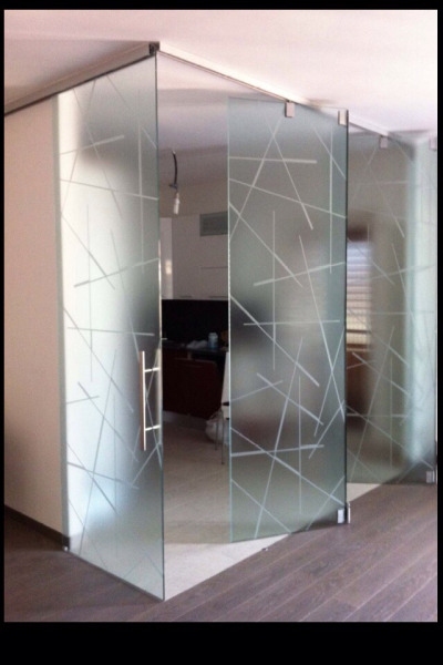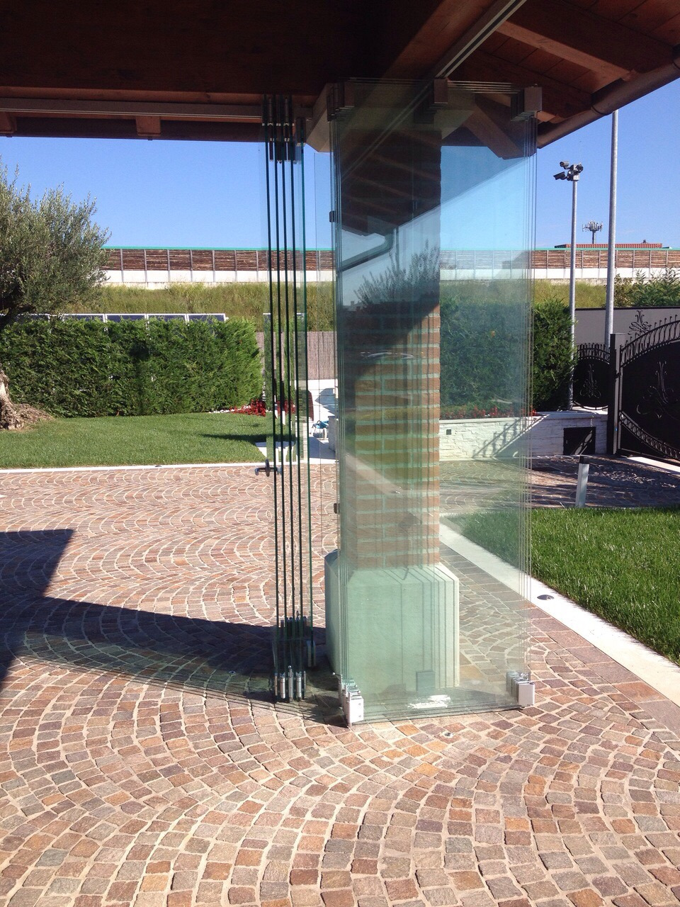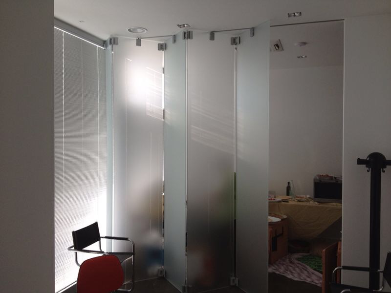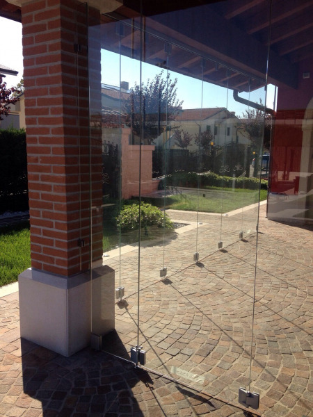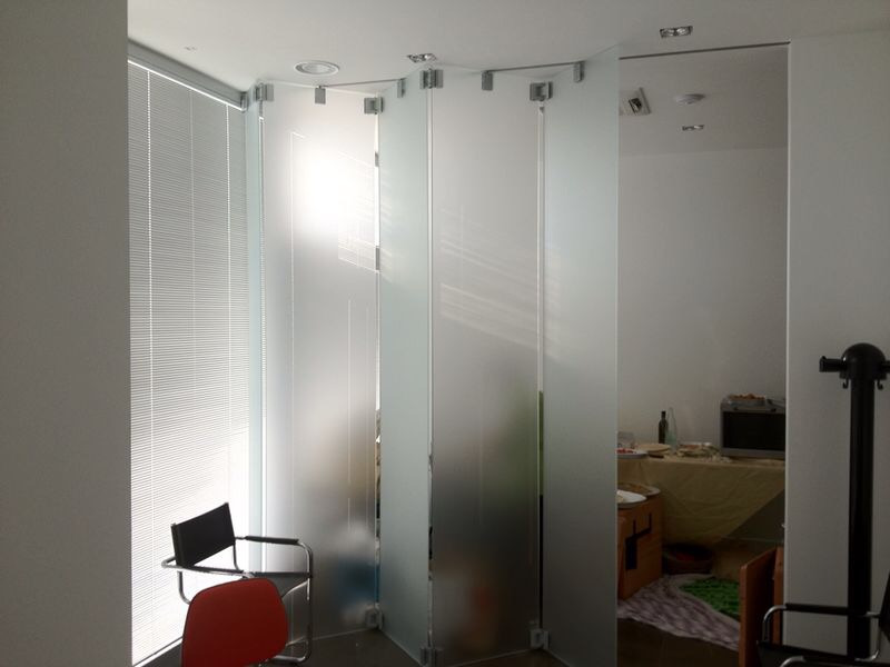 Centre folding system, visible hinges and holes in glass, including rail h=44 mm x L=64 mm and carriage with 4 wheels.
