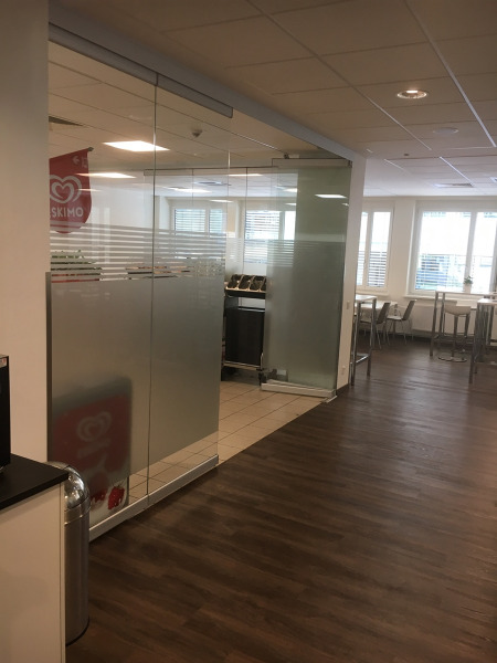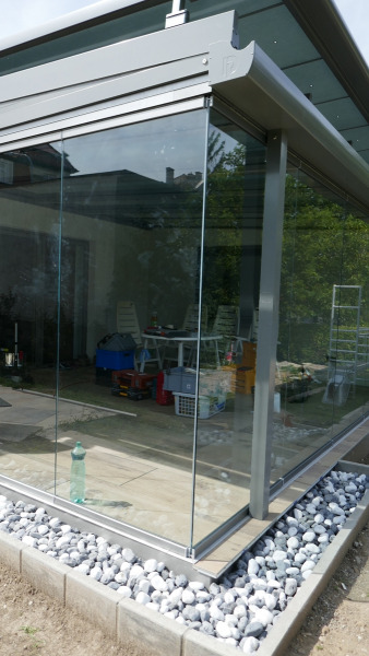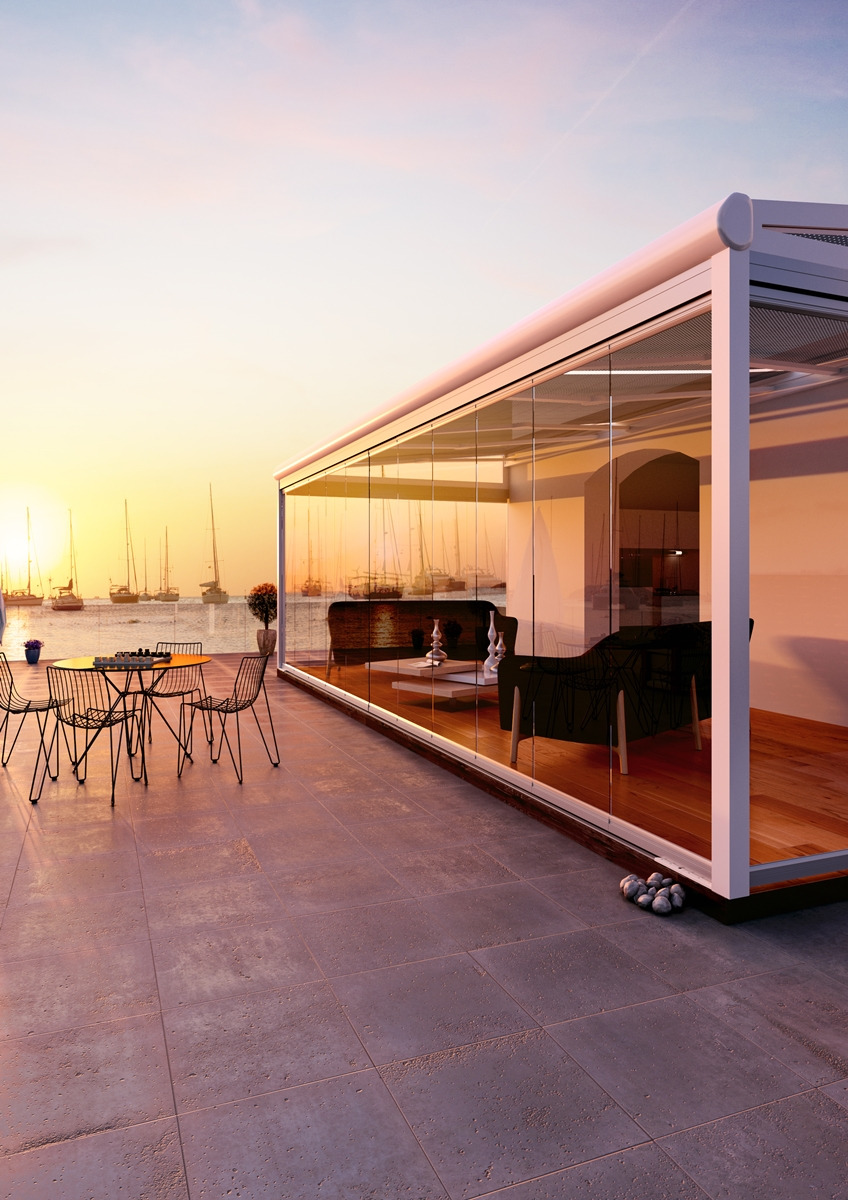 Slide and turn system, with floor channel and without parking bay, panels without holes in the glass.
