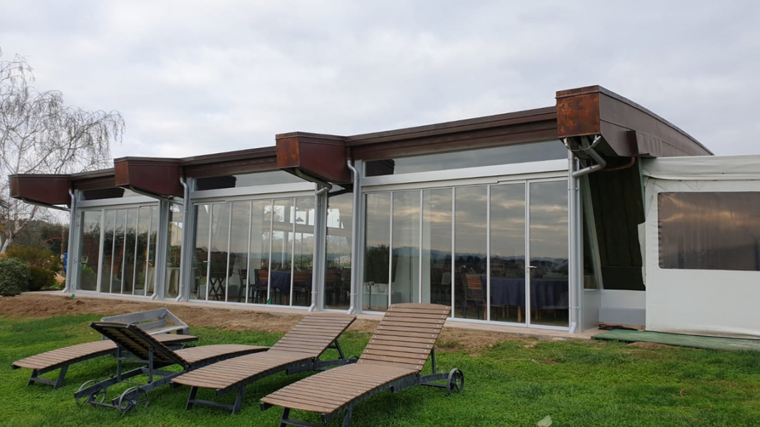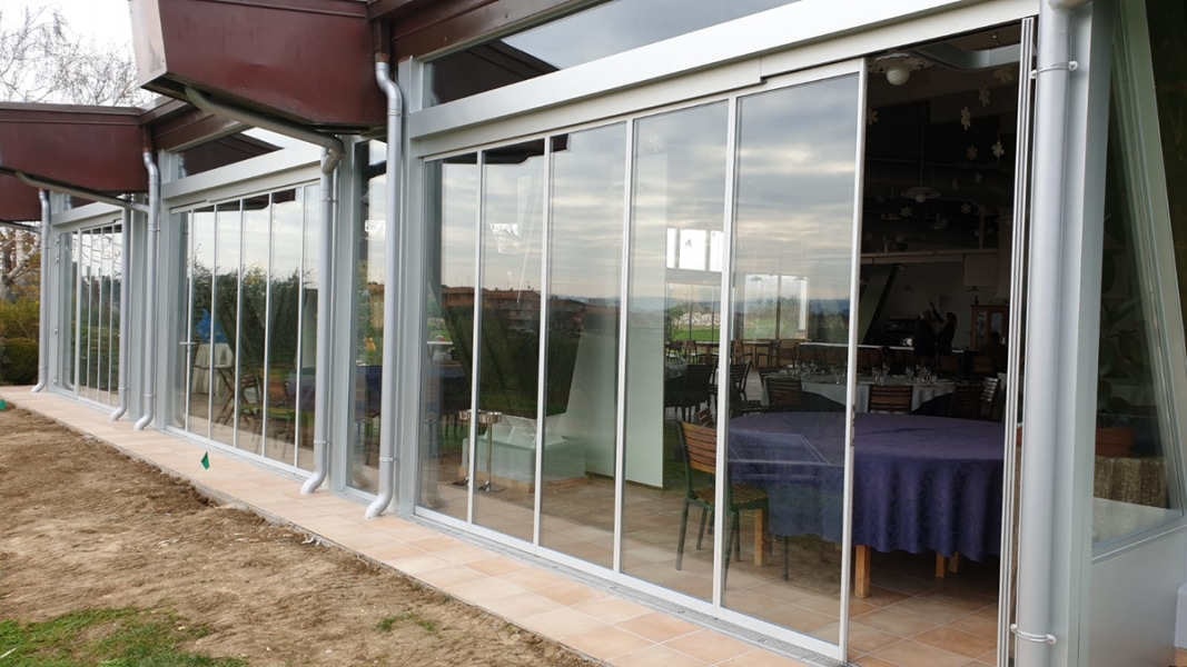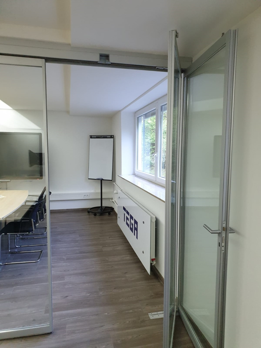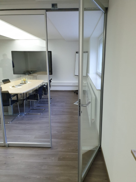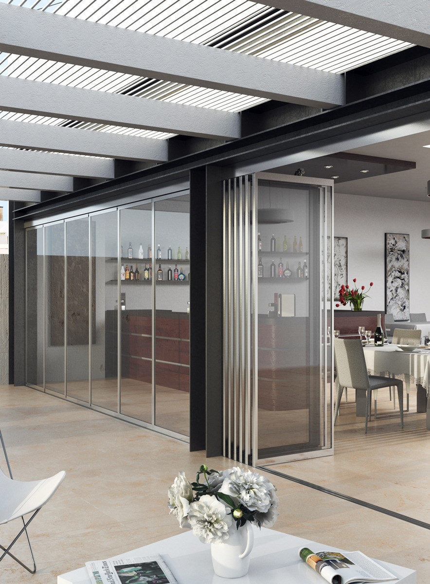 Slide and turn system, with floor channel and without parking bay, with profiles for framed glass door, standard measures up to 1000 x 3000 mm, cut by installer.
