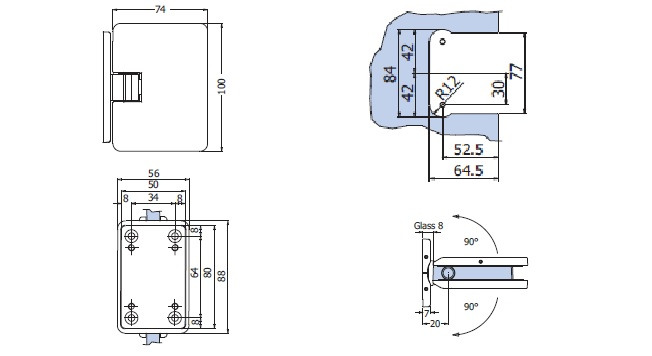 Automatic hinge opening 180°, with side fixing plate