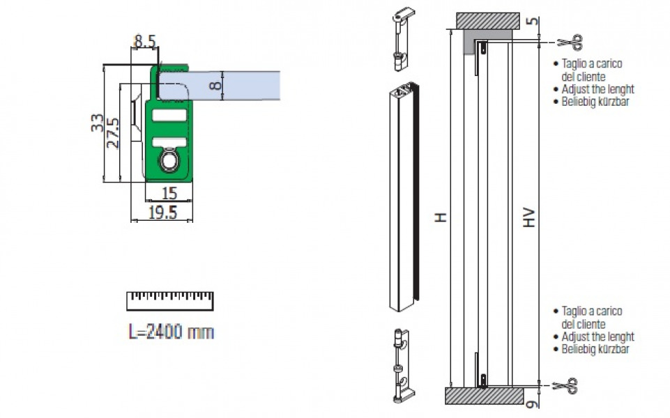 Hinge profile. Glass to be glued. For frames with rebate depth 40 mm. Hinge standard height 2400 mm.