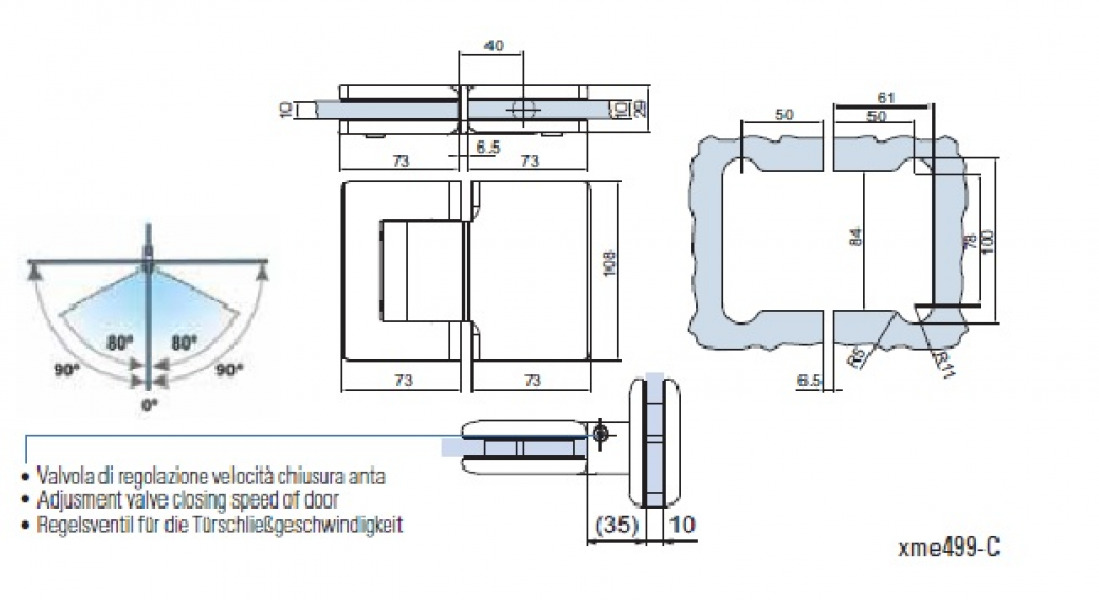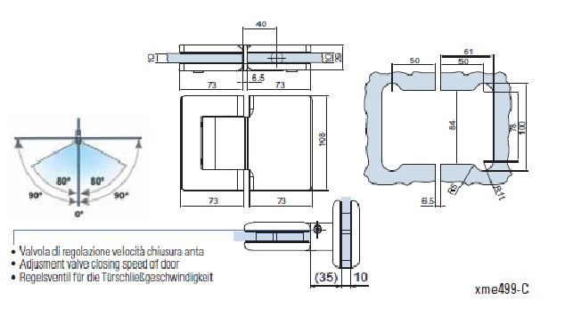 Hydraulic hinge (glass/glass) 180° with adjustment of the closing speed, stop at 0° + 90° - 90°.