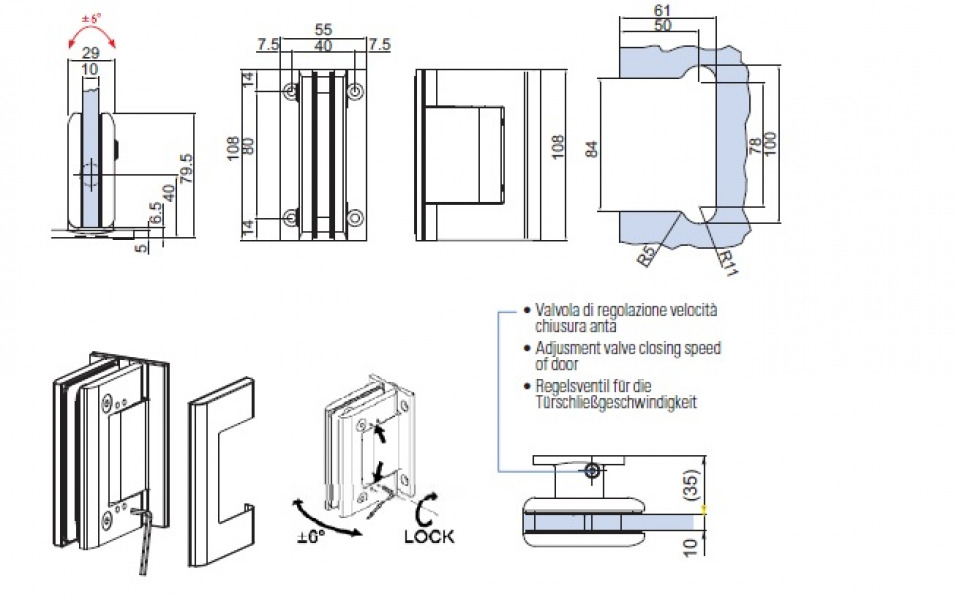 Hydraulic hinge with adjustment of the closing speed and zero point adjustability. Inner body is anodized and cover made of stainless steel AISI 316. Stop at 0° + 90° - 90°.