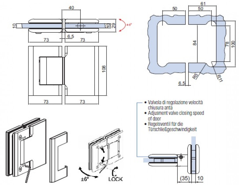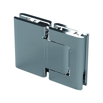 Hydraulic hinge (glass/glass) 180° with adjustment of the closing speed and zero point adjustability. Inner body is anodized and cover made of stainless steel AISI 316. Stop at 0° + 90° - 90°.