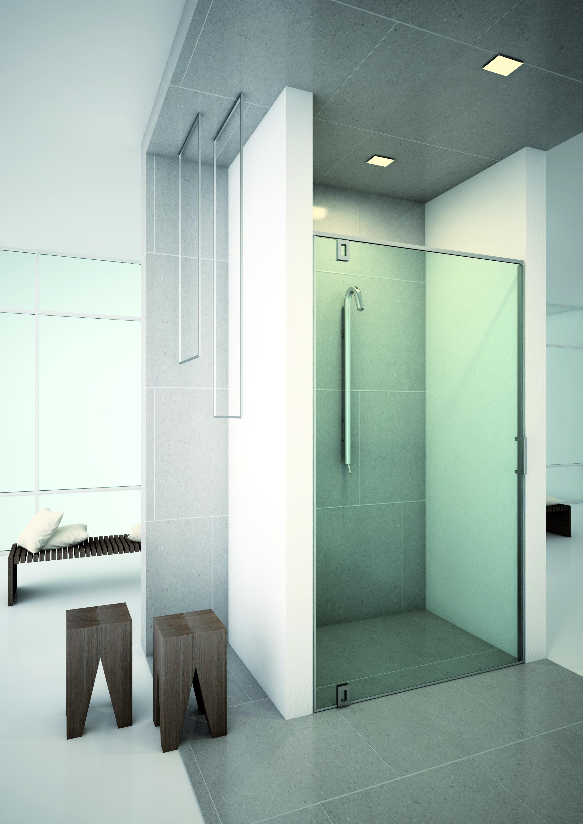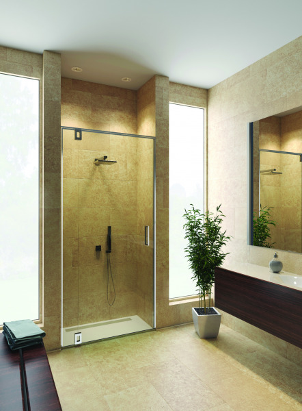 Frameless glass shower system with Bilico for pivot doors.