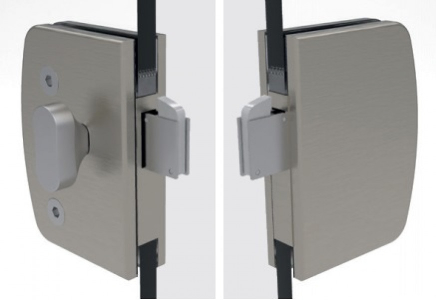 Lock with hook for sliding doors with visible screws. Strike plate not included