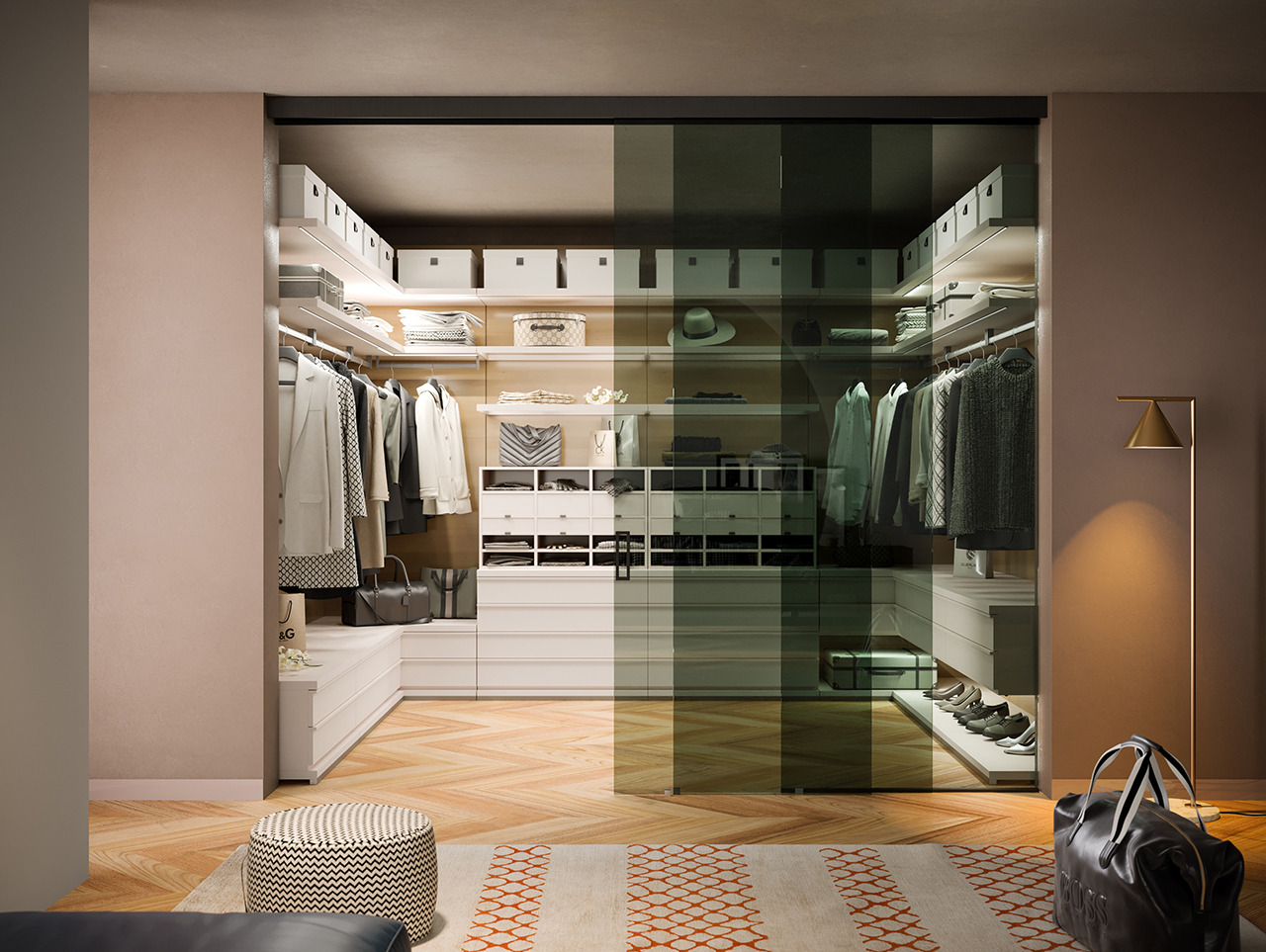Telescopic sliding door system ceiling/wall installation for 3 panels with fixed panel, synchro/mechanical dragging. Handles, endcaps and soft-close not included