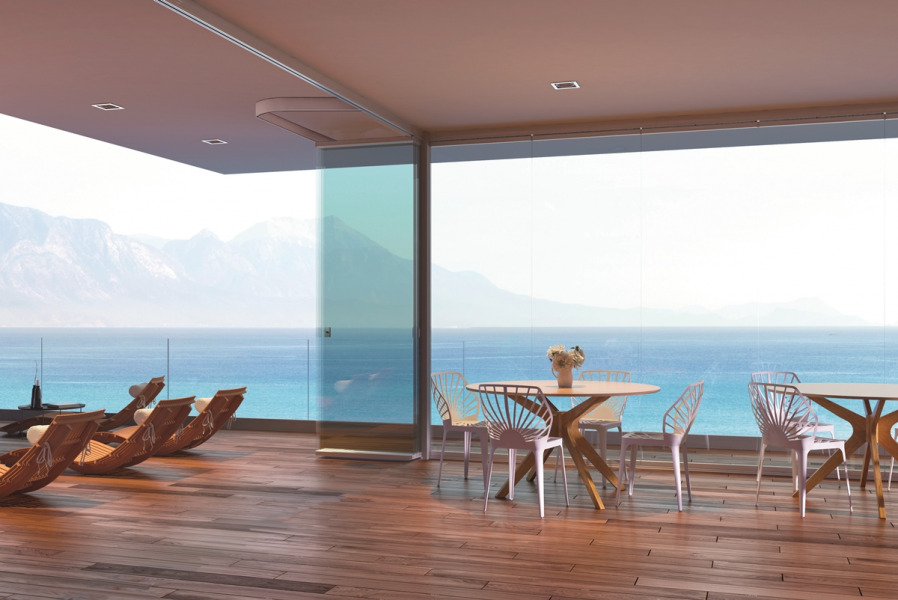 Sliding stacking system for glass thickness up to 17.52 with glass fixing profiles made to measure upon client’s request, no need to make holes in the glas
