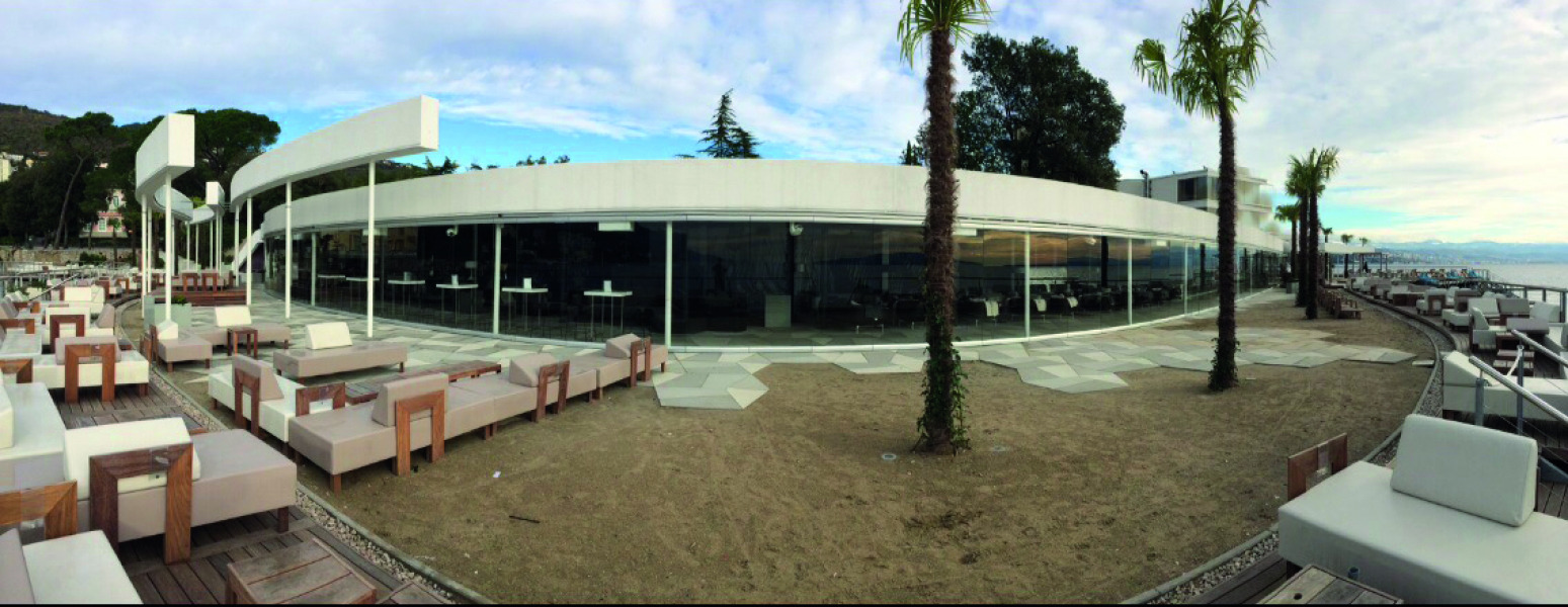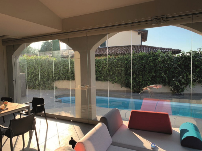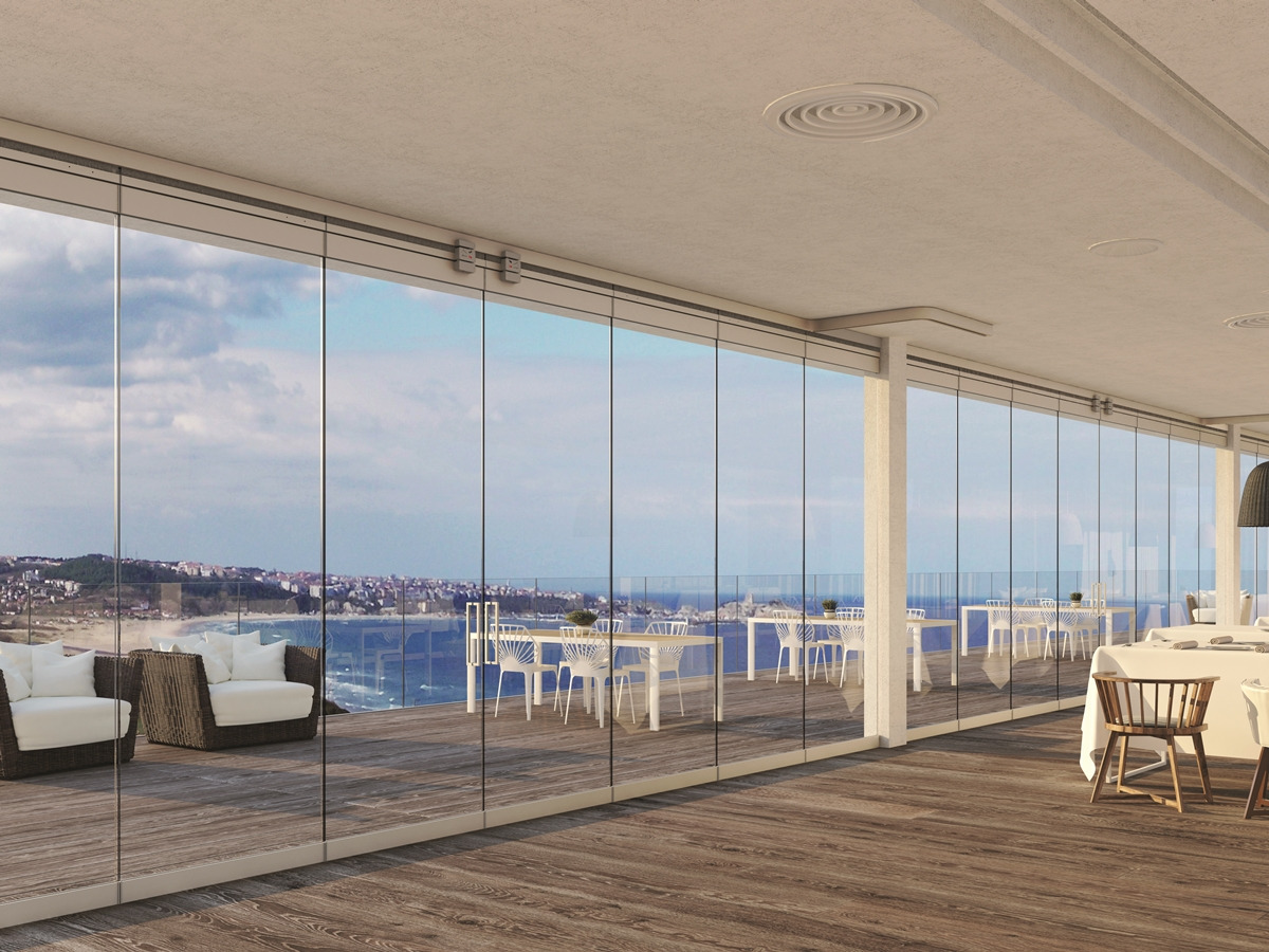 Sliding stacking system with glass fixing profiles made to measure upon client’s request, no need to make holes in the glass and with the possibility of hinged and parkable central panel.