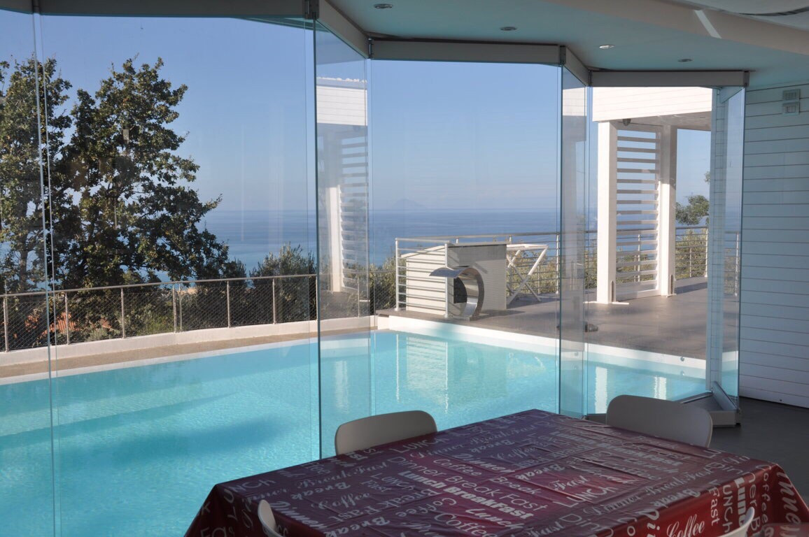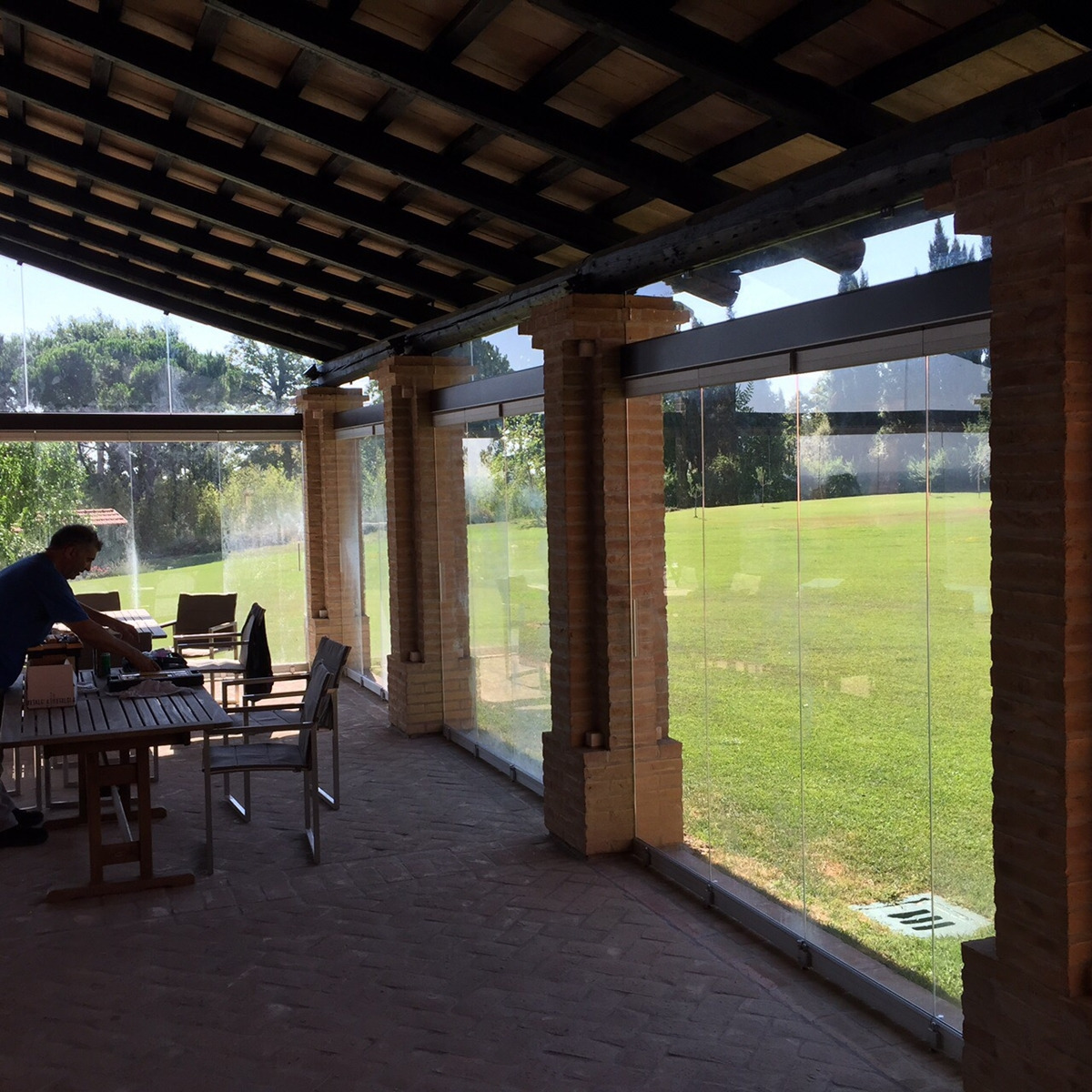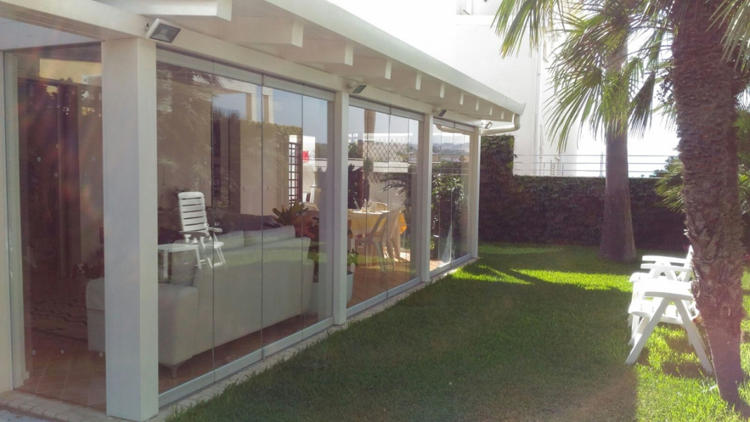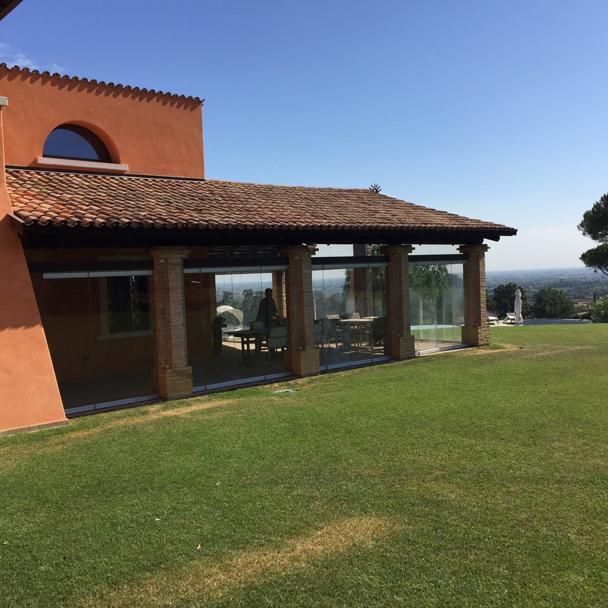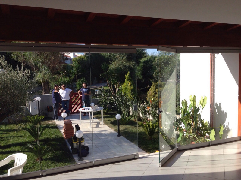 Sliding folding door system with continuous glass fixing profiles of a standard size (mm 1000) to be cut on the basis of client’s requirements comes equipped with an adjustable