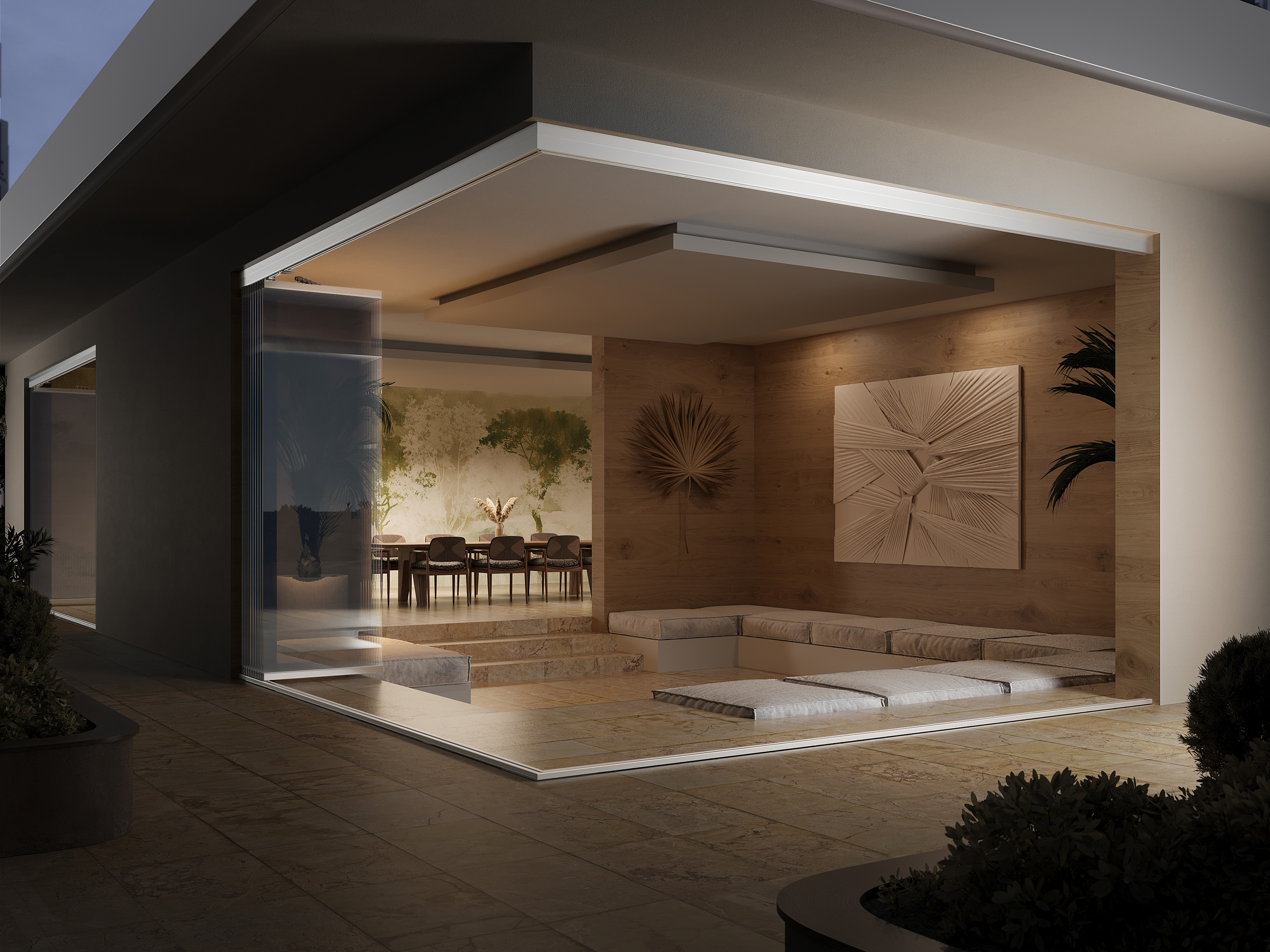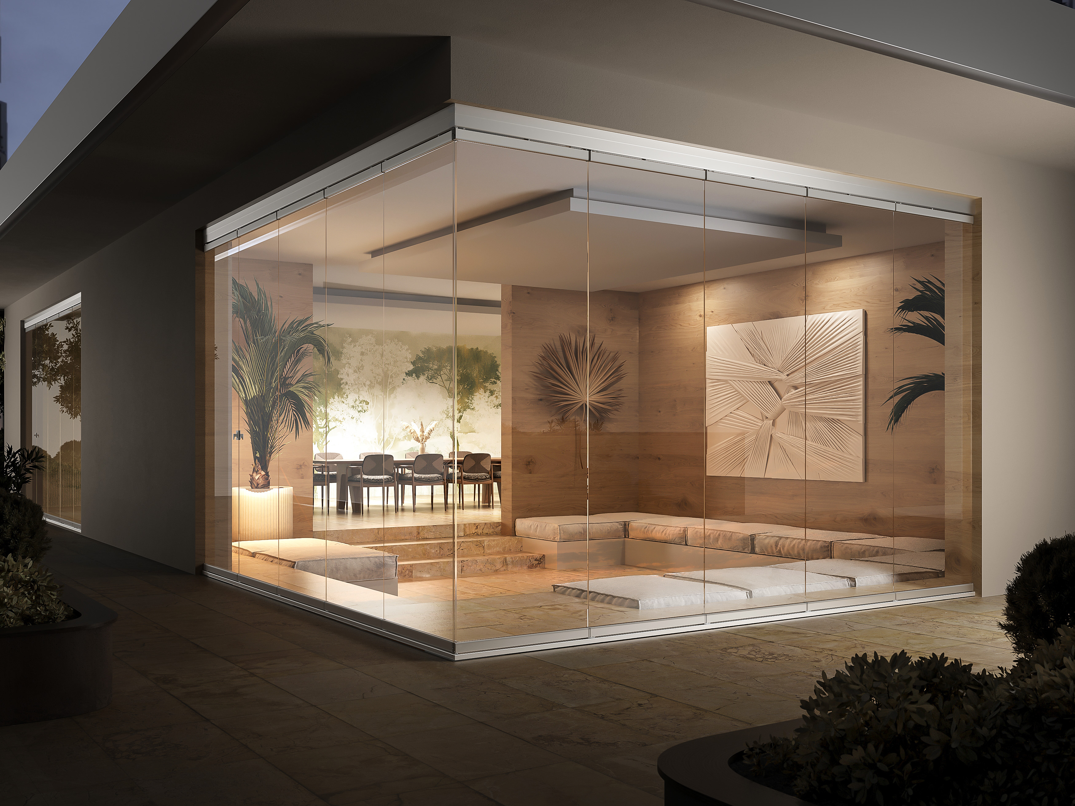 Slide and turn system with bottom guide and without parking bay. Panels without holes in the glass or profiles to be glued with holes in the glass.