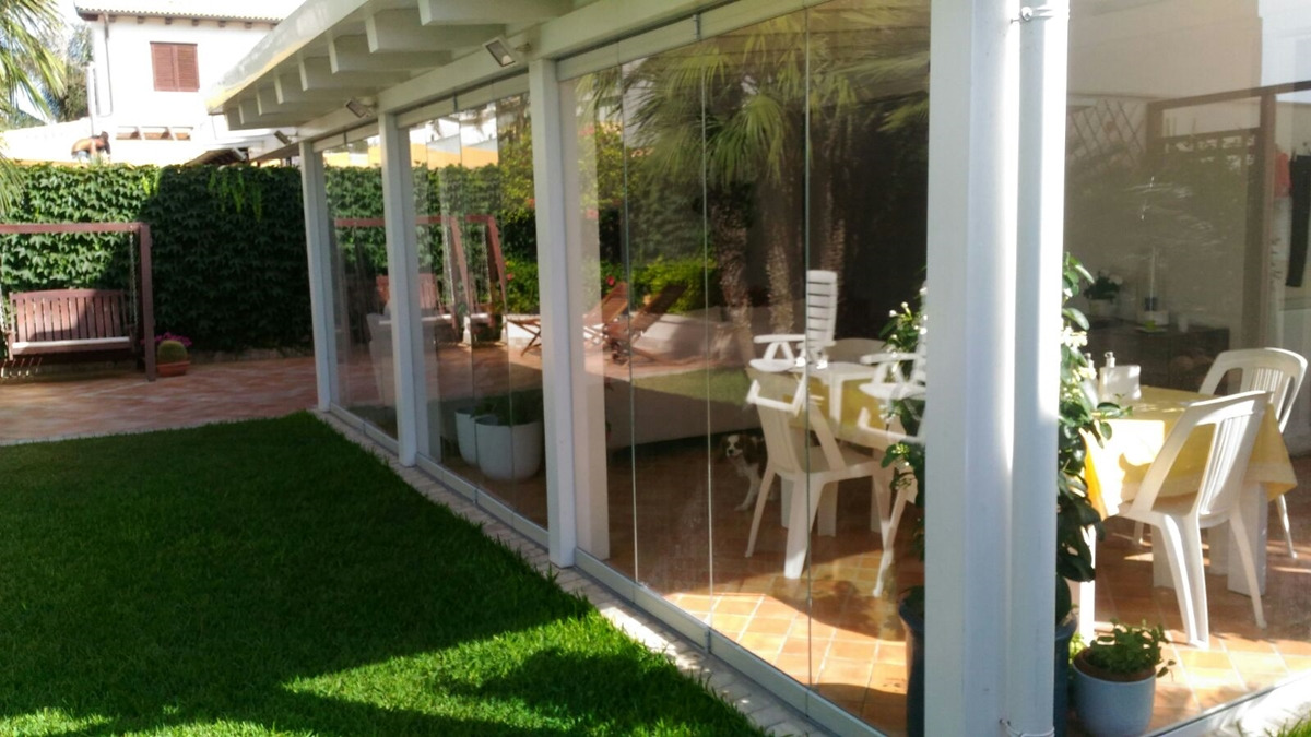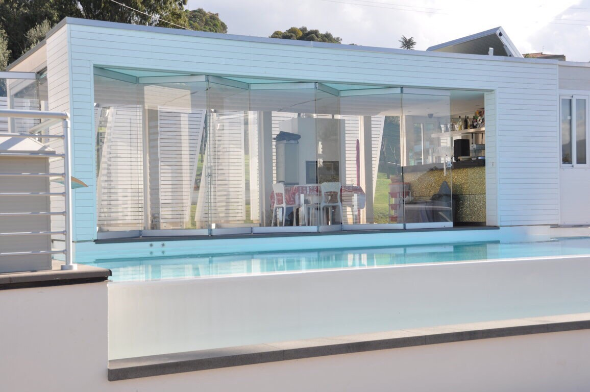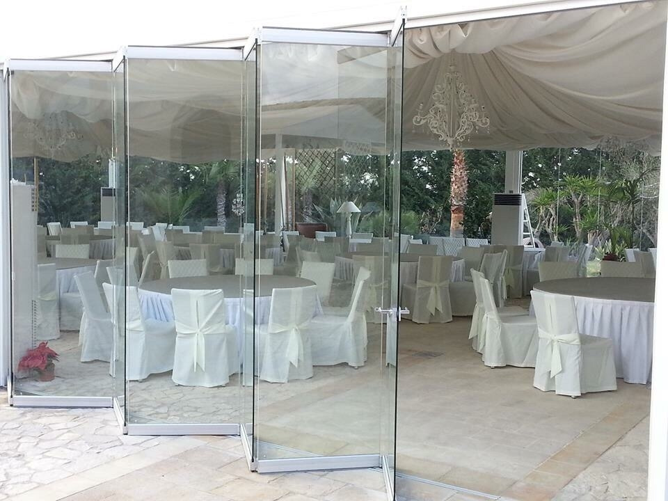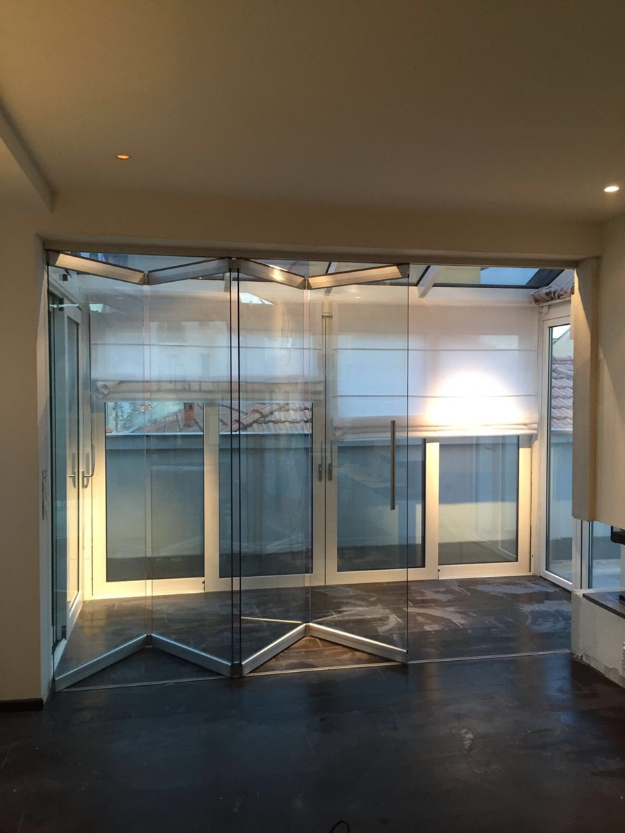 Sliding folding door system for thickness 16,76 and 17,52 mm. with glass fixing profiles made to measure upon client’s request with an adjustable door holding latch positioned externally.