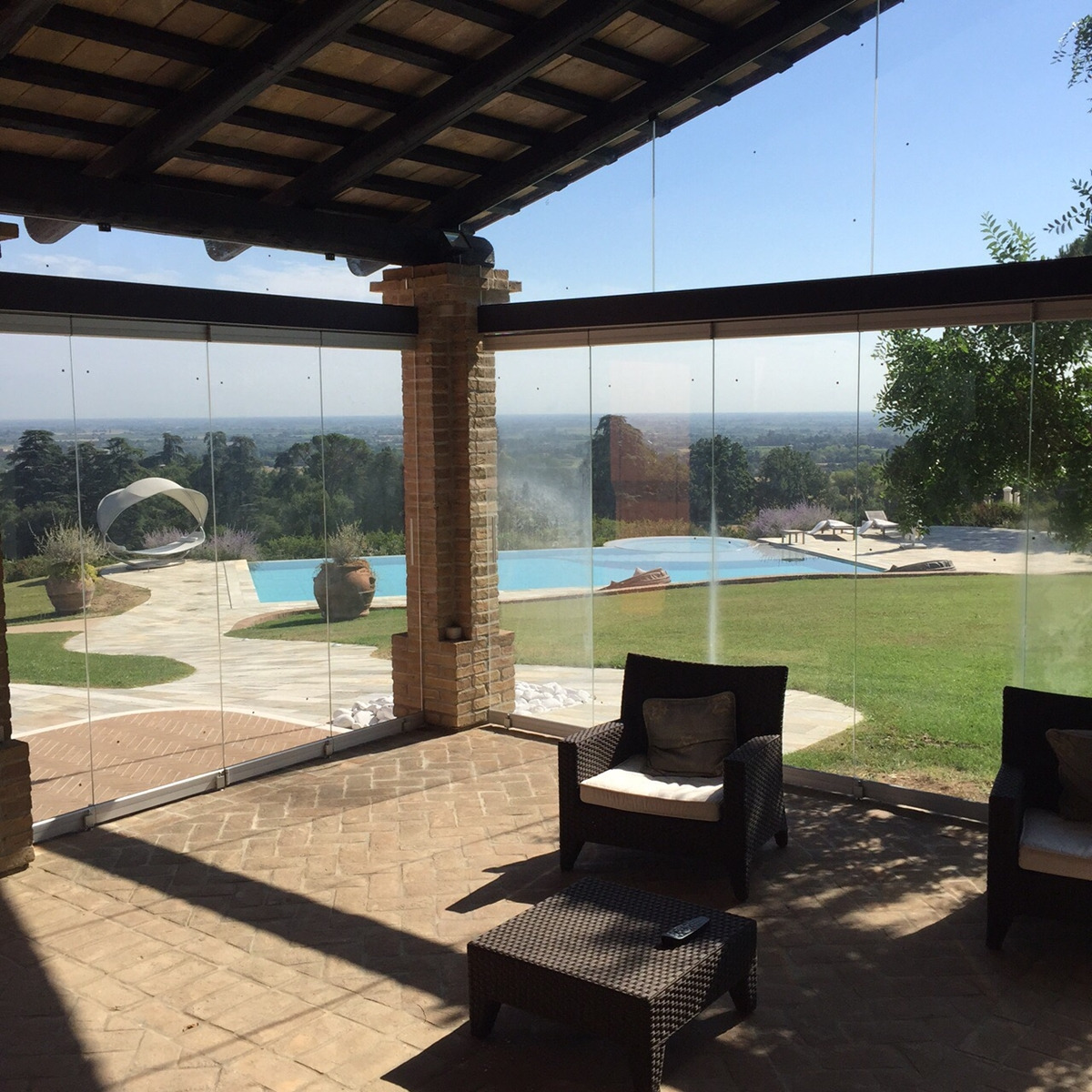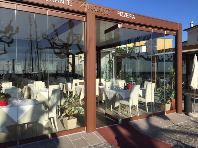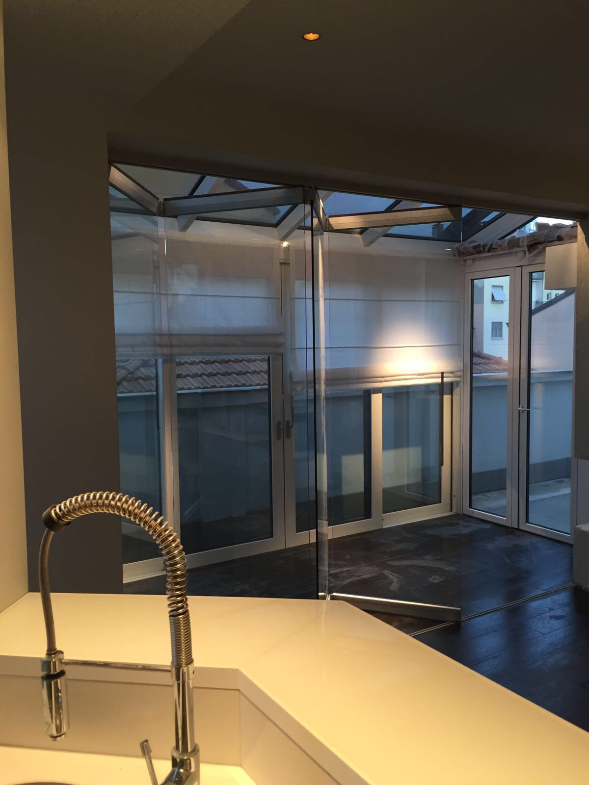 Sliding folding door system for thickness 16,76 and 17,52 mm. with glass fixing profiles made to measure upon client’s request with an adjustable door holding latch positioned externally.