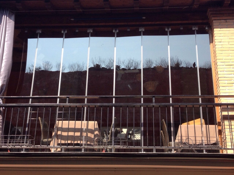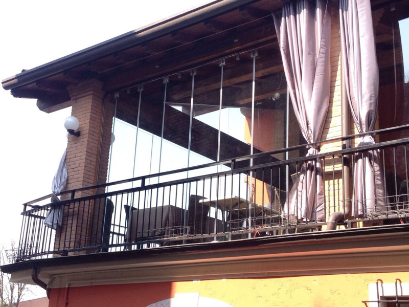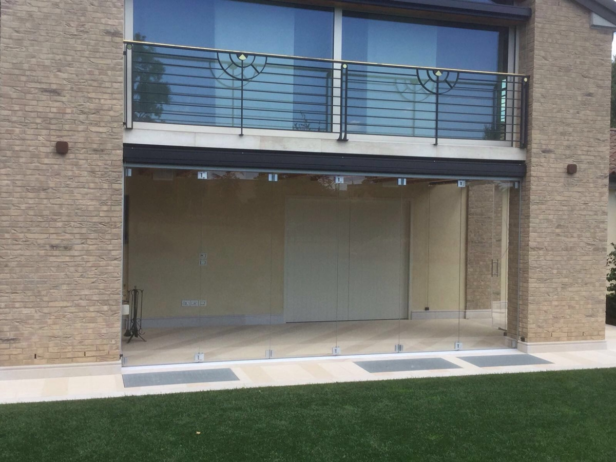 Sliding folding door system with visible hinges and holes in glass, including standard rail h=44 mm x L=64 mm and carriage with 4 wheels.
