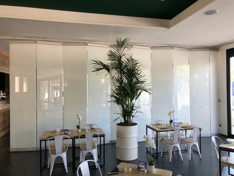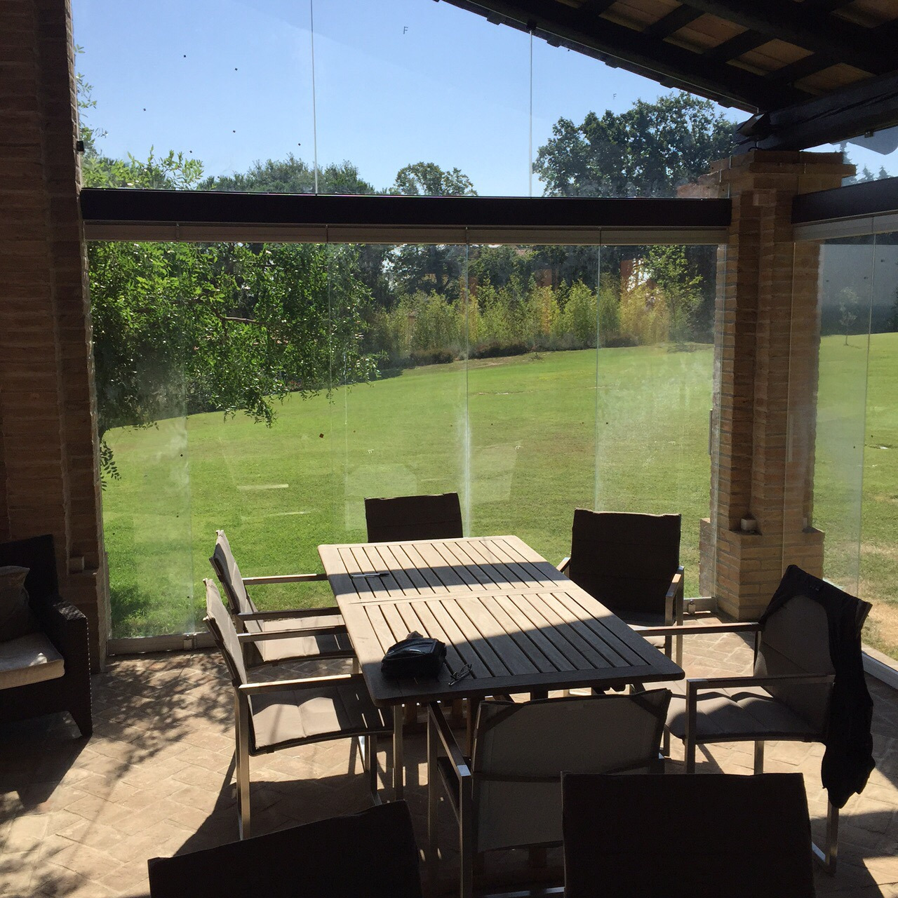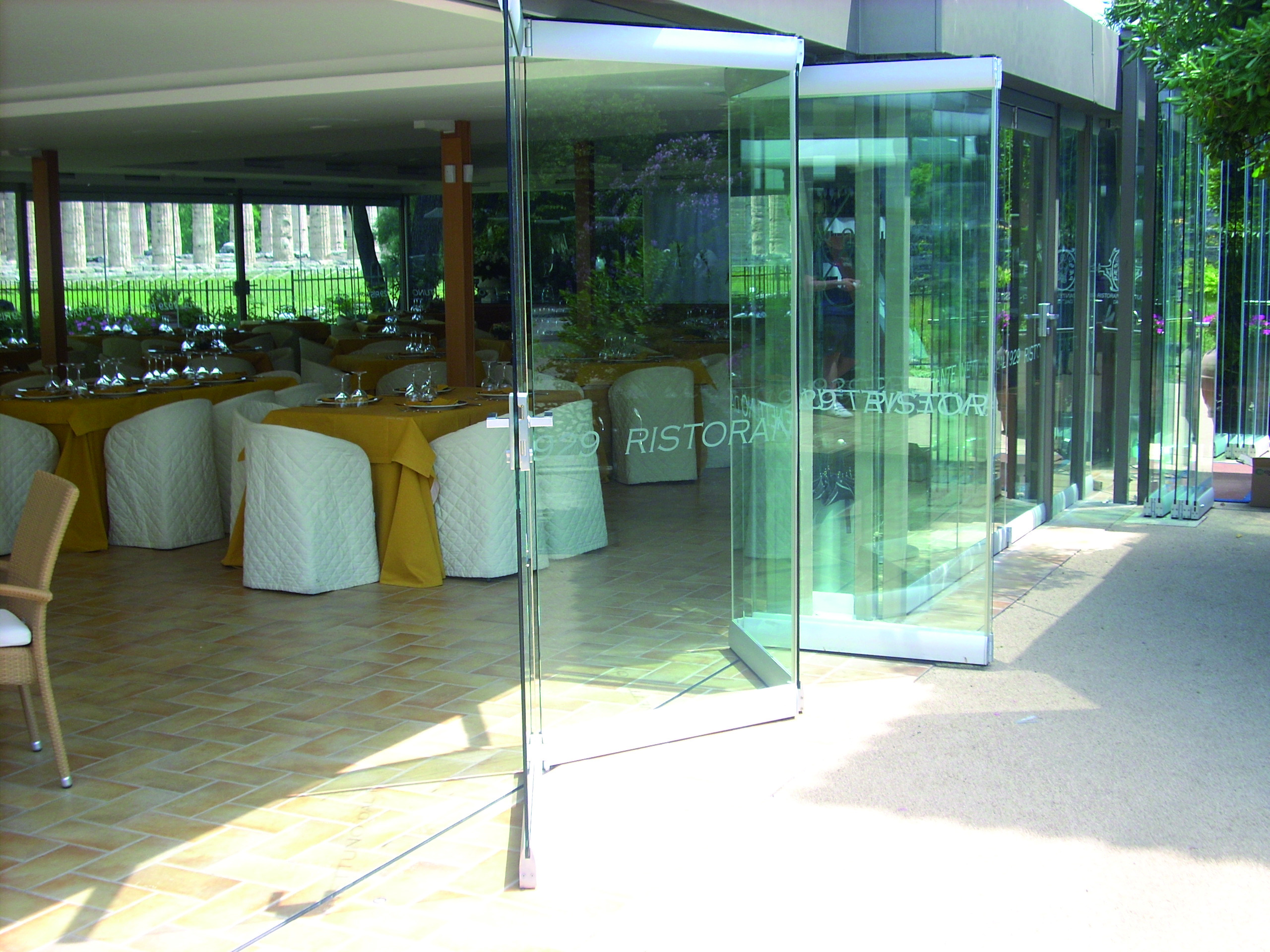 Folding door system with central fold with glass fixing clamps (mm 250) and continuous covers (mm 1200) to be cut on the basis of client’s requirements, and including standard rail standard h=75 mm x L=70 mm and carriage with 8 wheels.